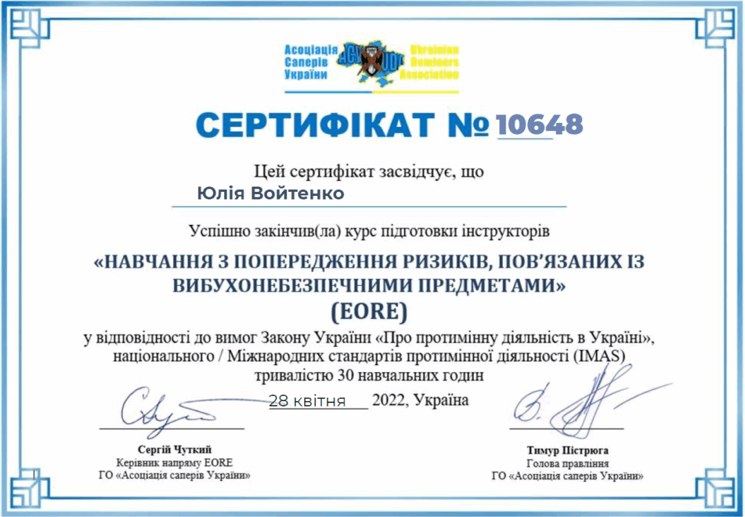 1. «Навчання з попередження ризиків, пов’язаних з вибухонебезпечними предметами». Асоціація саперів України. 20.04-28.04.2022 р., 1 кредит. Затв. ВР ФТФ 24.04.2023, пр. №10.