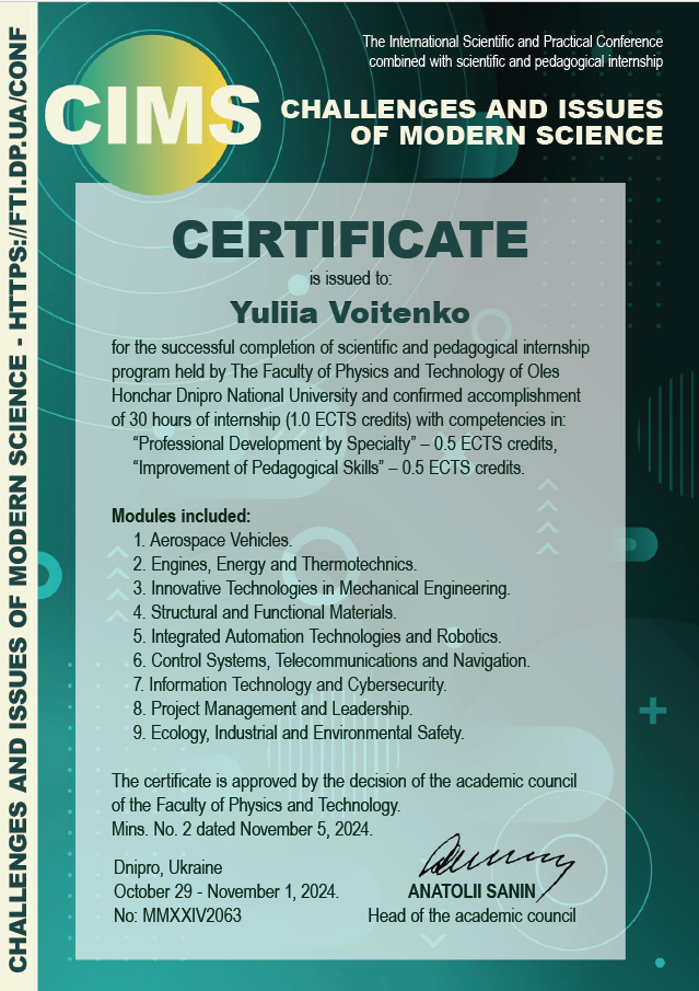 4. Науково-педагогічне стажування «Сhallenges and issues of modern science», 29 жовтня–1 листопада 2024р.: Сертифікат № MMXXIV2063 від 5.11.24 р., 1 кредит. Затв. ВР ФТФ 05.11.2024, пр. №2.