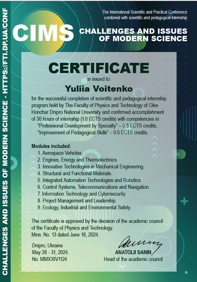 3. Науково-педагогічне стажування «Сhallenges and issues of modern science», 28–31 травня 2024р: Сертифікат № MMXXIV1124 від 18.06.24 р., 1 кредит. Затв. ВР ФТФ 18.06.2024, пр. №13.