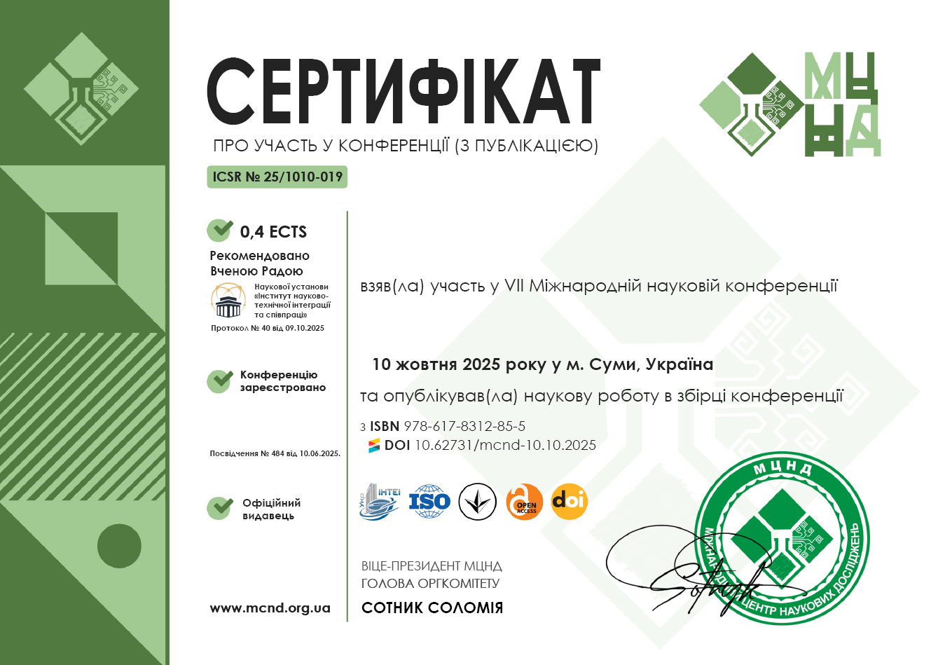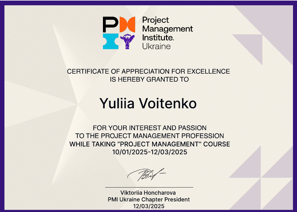 6. Сourse «Рroject management» 01.10.25–03.12.25 р., 2 кредити. Затв. ВР ФТФ 15.01.26, пр. № 2. 7. Участь у VII Міжнародній науковій конференції «Інновації та науковий потенціал світу». Сертифікат ICSR№ 25/1010-019 від 10.10.25 р., 0,4 кредити.