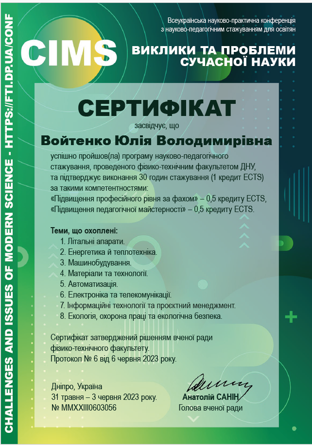 2. Науково-педагогічне стажування «Виклики та проблеми сучасної науки», 31 травня–3 червня 2023р.: Сертифікат №MMXXIII0603056 від 6.06.23 р., 1 кредит. Затв. ВР ФТФ 06.06.2023, пр. №6.
