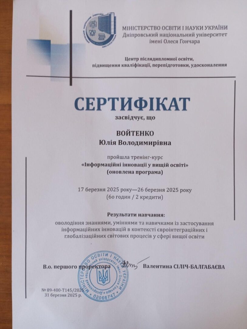 5. Навчально-методичний центр післядипломної освіти, підвищення кваліфікації та до університетської підготовки, стажування з 17.03.2025–26.03.2025 р. тренінг-курс «Інформаційні інновації у вищій освіті» (оновлена програма). Сертифікат № 89-400-Т145/2025 від 31.03.25 р., 2 кредити.