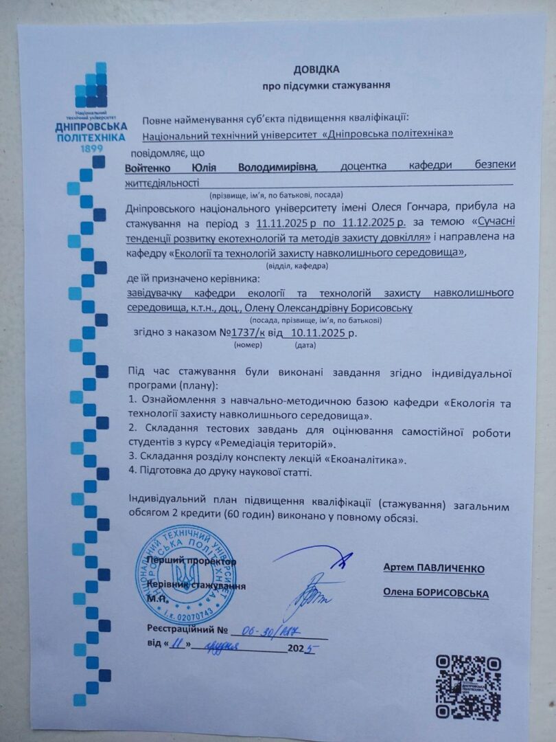 8. Національний технічний університет «Дніпровська політехніка». Тема: Сучасні тенденції розвитку екотехнологій та методів захист довкілля. Довідка про стажування на кафедрі «Екологія та технології захисту навколишнього середовища» з 11.11.2025 по 11.12.2025, № 06-30/127 від 11.12.2025, 2 кредити.