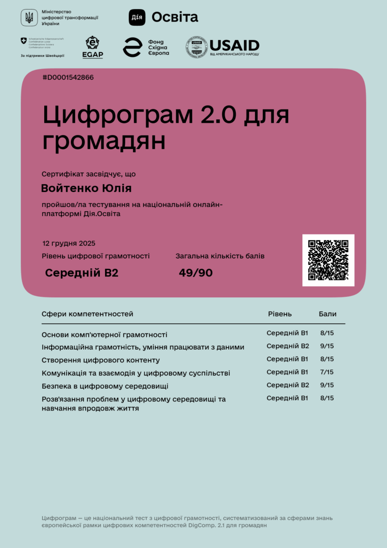 9. Цифрограм 2.0 для громадян на національній онлайн-платформі Дія. Освіта. Сертифікат D0001542866 від 12.12.25 р., 2 кредити. Затв. ВР ФТФ 15.01.26, пр. № 2.