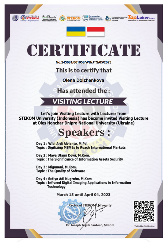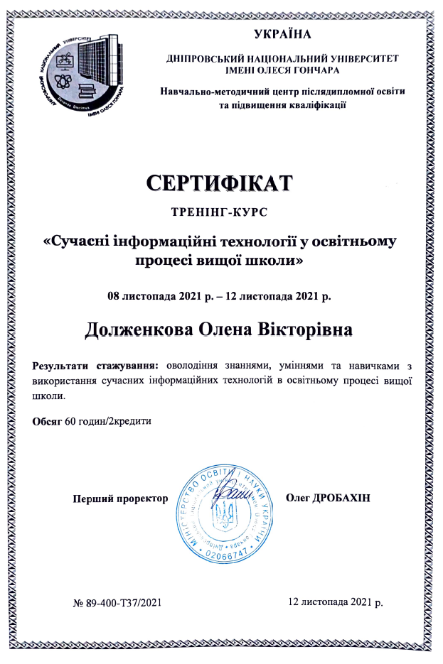 1. Навчально-методичний центр післядипломної освіти та підвищення кваліфікації ДНУ; програма «Сучасні інформаційні технології у освітньому процесі вищої школи», 08.11-12-11.2021; сертифікат №89-400-ТЗ7/2021 від 12.11.2021, 2 кредити.