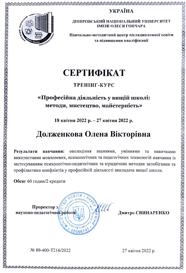 2. Навчально-методичний центр післядипломної освіти та підвищення кваліфікації ДНУ; програма «Професійна діяльність у вищій школі: методи, мистецтво, майстерність» 18.04-27.04.2022, сертифікат № 89-400-Т216/2022 від 27.04.2022, 2 кредити.