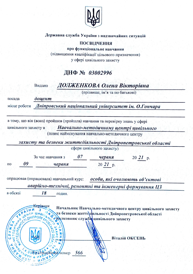 3. Навчально-методичний центр цивільного захисту та безпеки життєдіяльності Дніпропетровської області, тема «Навчальний курс для осіб, які очолюють об’єктові аварійно-технічні, ремонтні та інженерні формування ЦЗ» 07.06.2021 р. – 09.06.2021 р. Посвідчення ДНФ № 03002996, 18 годин, 0,6 кредити.