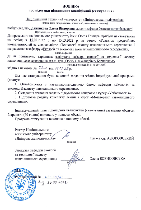 4. Національний технічний університет «Дніпровська політехніка», стажування за напрямом: «Підвищення професійних компетентностей за спеціальністю «Технології захисту навколишнього середовища» 15.02-15.03.2022,наказ 79-К від 14.02 2022, 2 кредити.