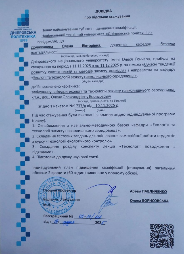 14. Національний технічний університет «Дніпровська політехніка». Сучасні тенденції розвитку екотехнологій та методів захисту довкілля. Довідка про стажування на кафедрі «Екологія та технології захисту навколишнього середовища» з 11.11.2025 по 11.12.2025, № 06-30/126 від 19.12.2025, 2 кредити.