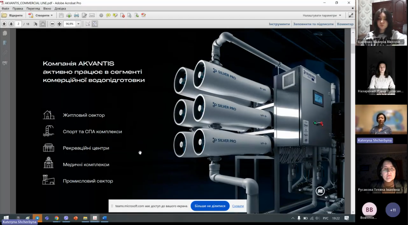Катерина Сергіївна цікаво, з прикладами на реальні об’єкти, розповіла про напрямки діяльності компанії. AKVANTIS активно працює в сегменті побутової та комерційної водопідготовки: житловий сектор, спорт та СПА комплекси, рекреаційні центри, медичні центри, промисловий сектор.