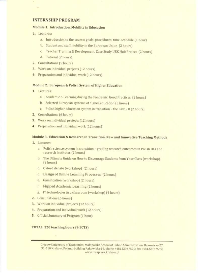 Учасник: проф. Тетяна Русакова Програма: Міжнародне післядипломне практичне стажування «Нові та інноваційні методи навчання» Обсяг: 120 академічних годин (4 кредити ECTS)