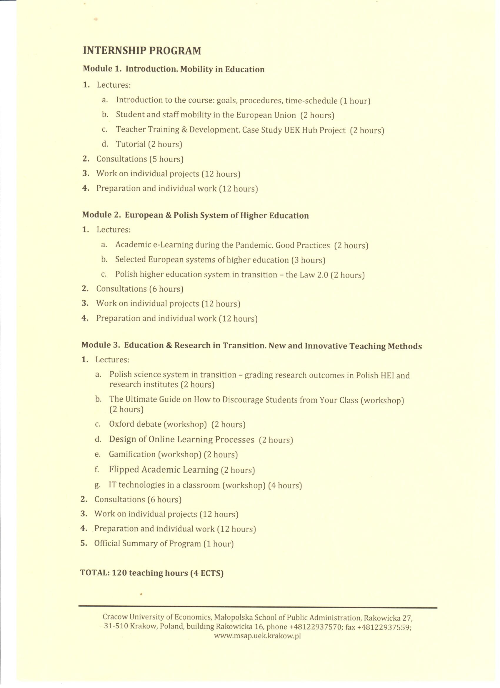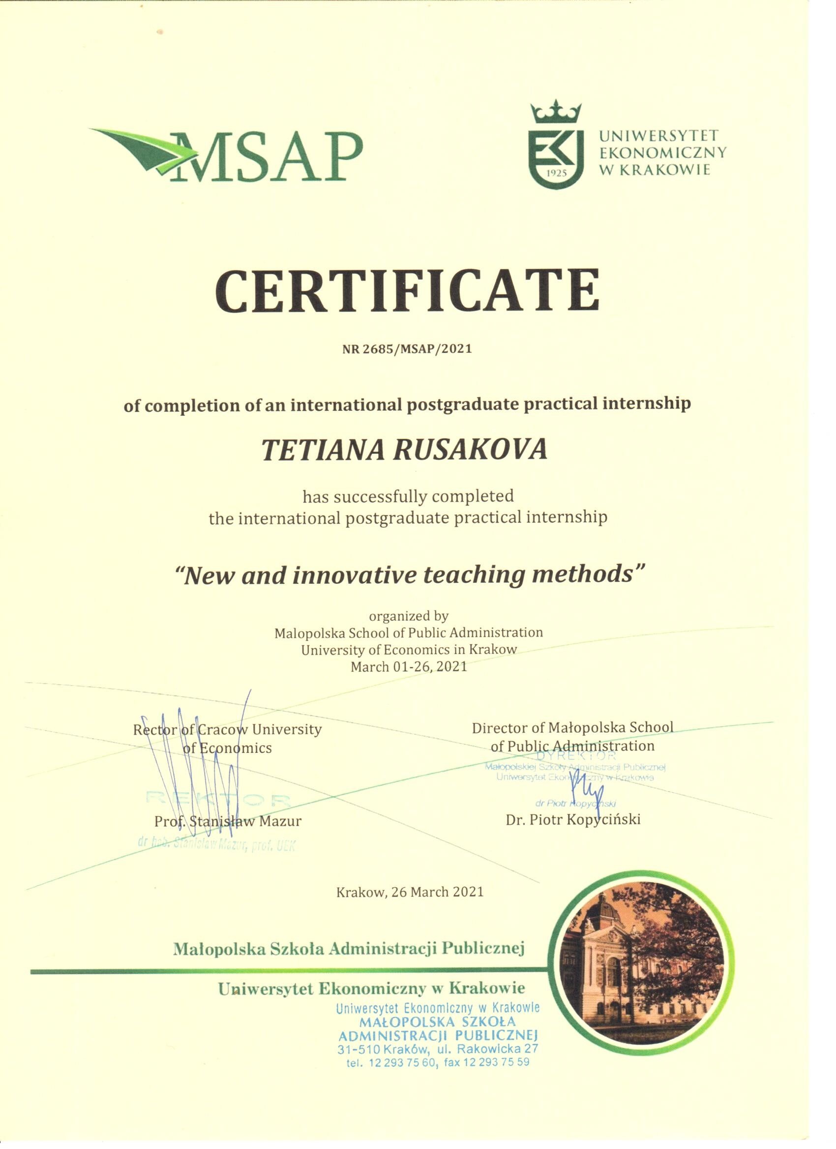 Учасник: проф. Тетяна Русакова Програма: Міжнародне післядипломне практичне стажування «Нові та інноваційні методи навчання» Обсяг: 120 академічних годин (4 кредити ECTS)