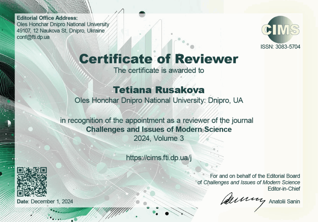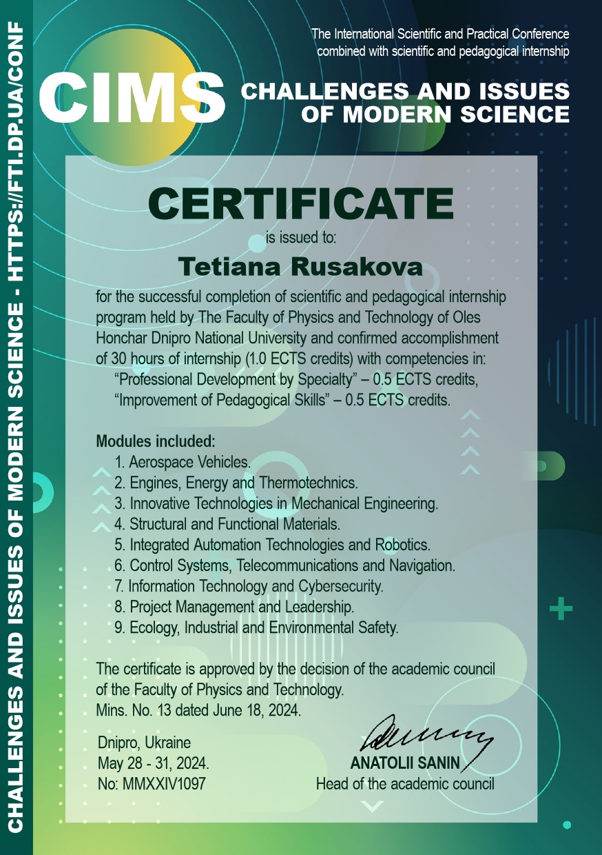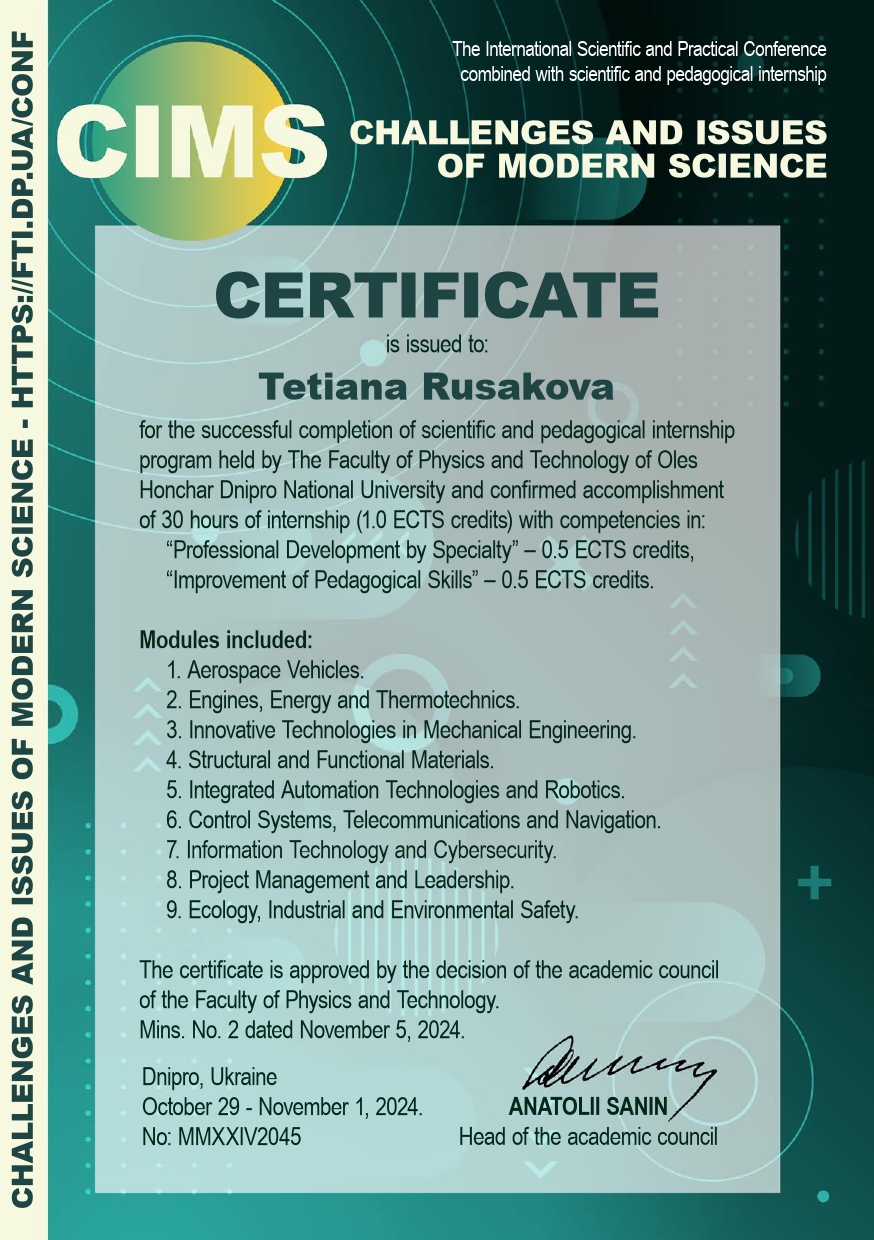 12. Науково-педагогічне стажування «Сhallenges and issues of modern science», 29.10–01.11.2024 р: Сертифікат №MMXXIV2045 – 1 кредит, затв. ВР ФТФ, пр. № 2 від 05.10.2024 р.