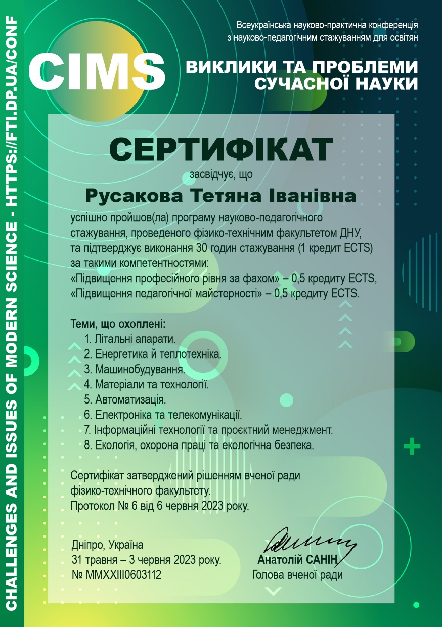 6. Науково-педагогічне стажування «Виклики та проблеми сучасної науки», 31.05.23–03.06.23: Сертифікат №MMXXIII0603112, 1 кредит, затв. ВР ФТФ, пр. № 6 від 06.06.2023 р.
