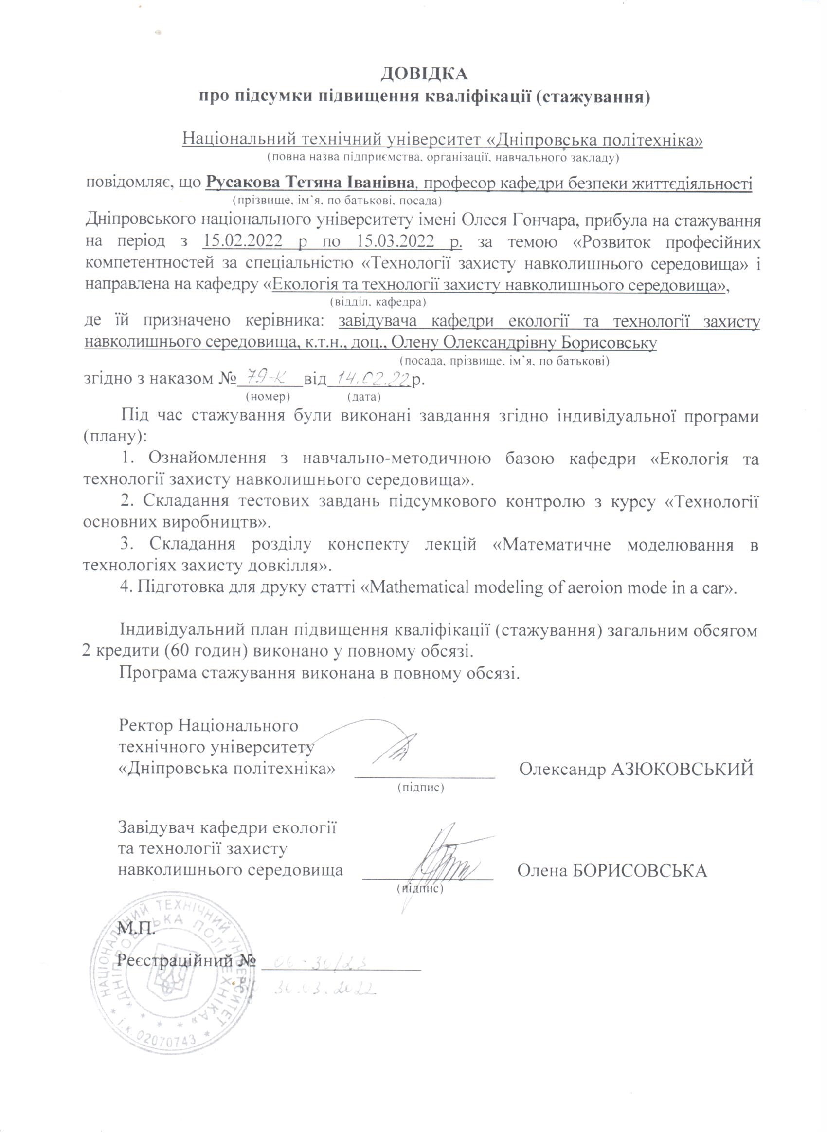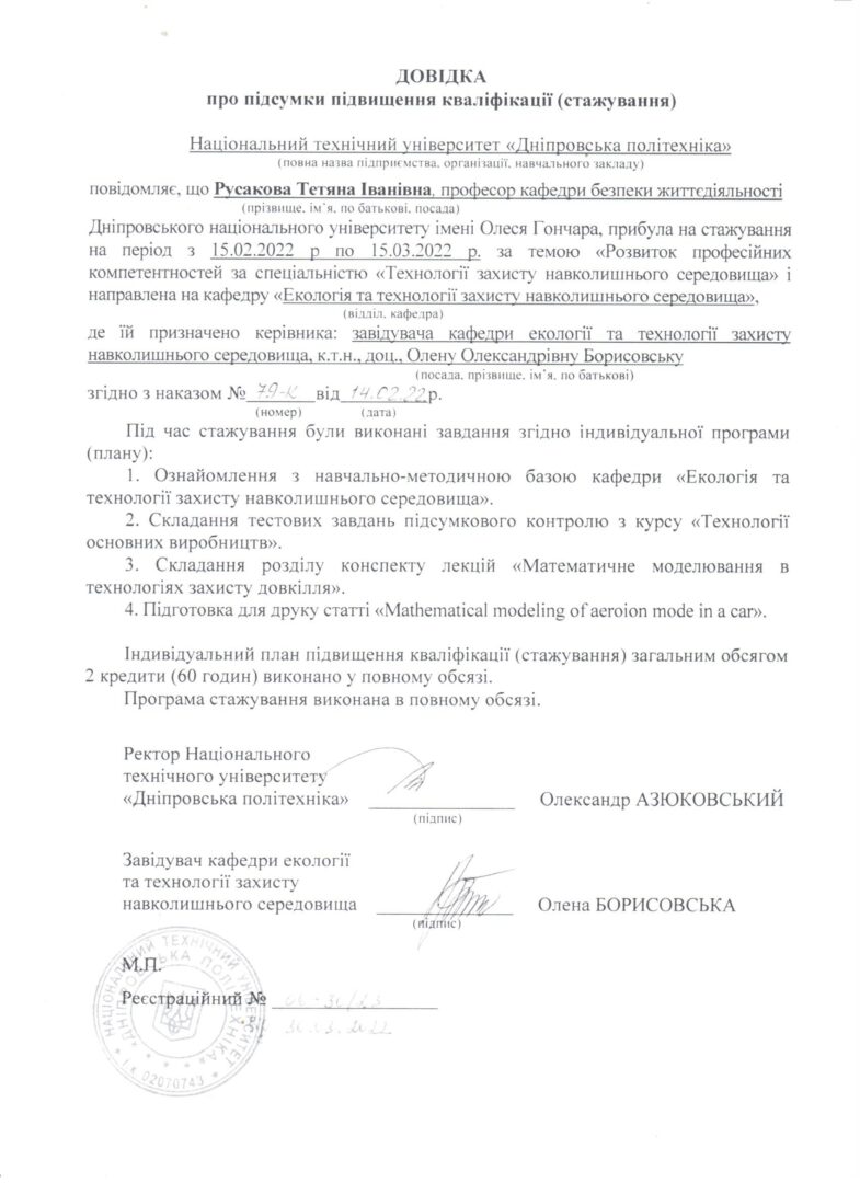 4. Національний технічний університет «Дніпровська політехніка», стажування за напрямом: «Підвищення професійних компетентностей за спеціальністю «Технології захисту навколишнього середовища» 15.02-15.03.2022, довідка № 06-30/23 від 30.03.2022, 2 кредити.