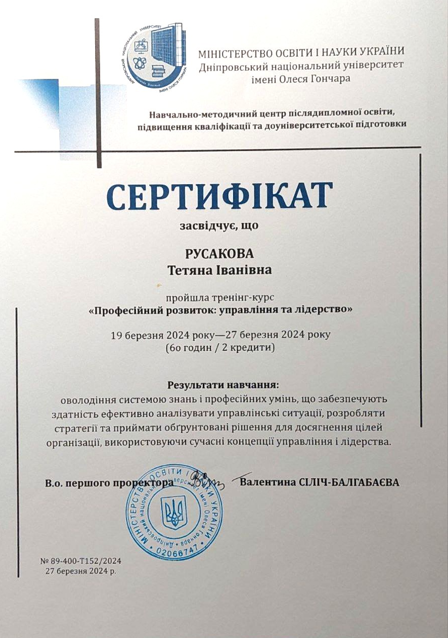 8. Тренінг-курс «Професійний розвиток: управління та лідерство», 19.03.2024-27.03.2024р., ДНУ, 2 кредити, сертифікат № 89-400-Т152/2024 від 27.03.2024.