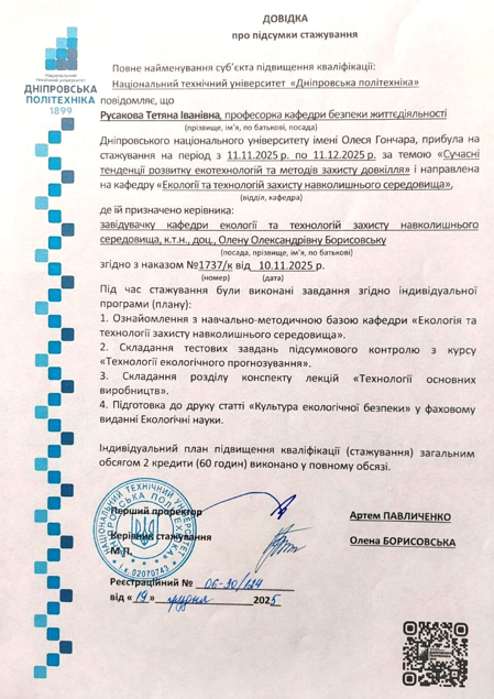 22. Національний технічний університет «Дніпровська політехніка». Сучасні тенденції розвитку екотехнологій та методів захисту довкілля. Довідка про стажування на кафедрі «Екологія та технології захисту навколишнього середовища» з 11.11.2025 по 11.12.2025, № 06-30/124 від 19.12.2025, 2 кредити.