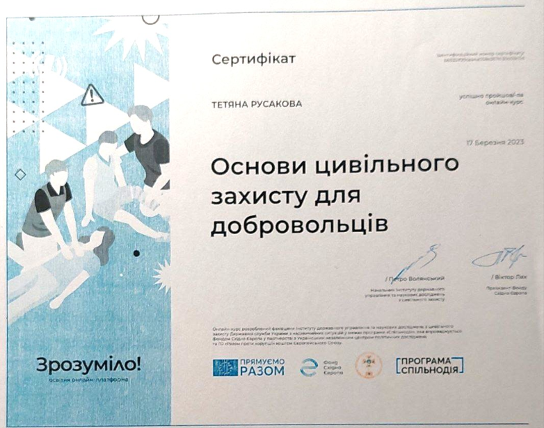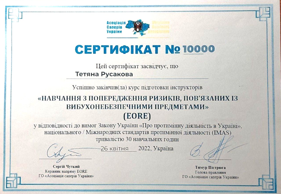 5. Асоціація саперів України. Тренінг-курс «Навчання з попередження ризиків, пов’язаних із вибухонебезпечними предметами» 20.04-26.04.2022, сертифікат № 10000 від 26.04.2022, 1 кредит, затв. ВР ФТФ, пр. № 4 від 25.04.2023 р.