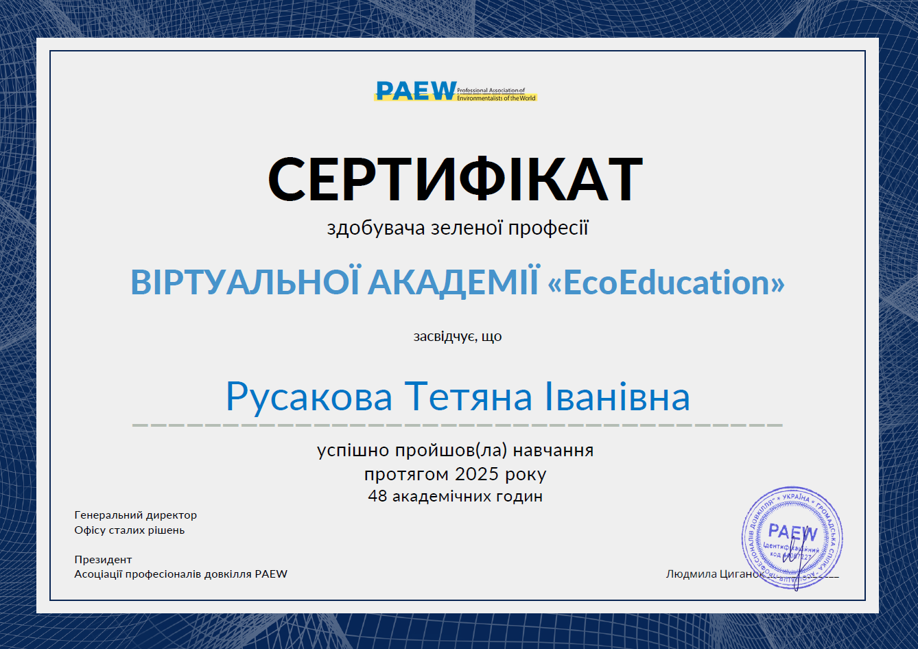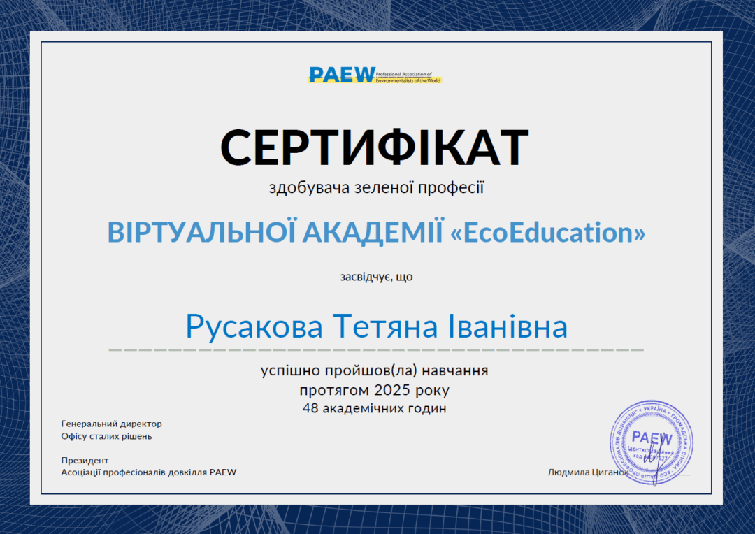 21. Ресурсозбереження, екологічна безпека. Professional Association of Environmentalists of the World «EcoEducation» впродовж 2025 р., сертифікат, 48 годин/1,6 кредити, Затв. ВР ФТФ 15.01.2026, пр. № 2.