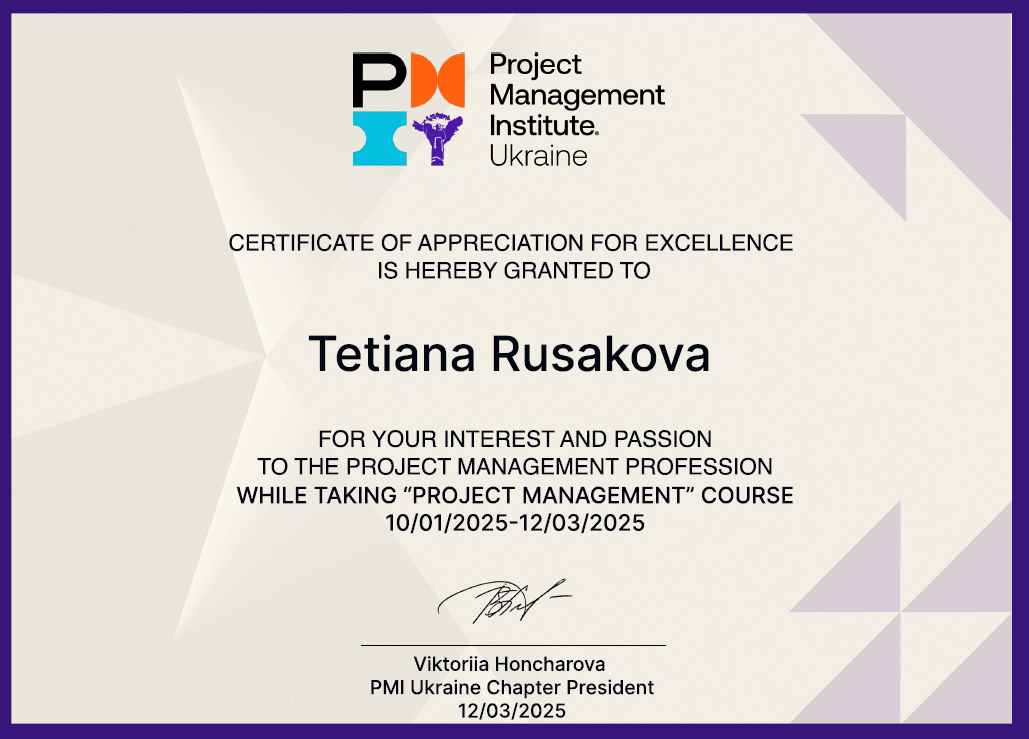 18. Сourse «Рroject management» 01.10.25–03.12.25 р., Institute Project Managemente Ukraine, certificate, 2 кредити. Затв. ВР ФТФ 15.01.2026, пр. № 2.