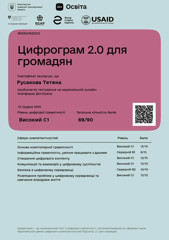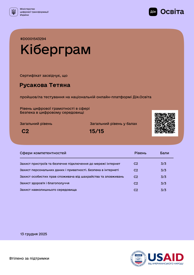19. Кіберграм. Рівень цифрової грамотності в сфері Безпека в цифровому середовищі. Міністерство цифрової інформації України, сертифікат D0001543294, від 13.12.2025 р., 0,5 кредити,. Затв. ВР ФТФ 15.01.2026, пр. № 2.