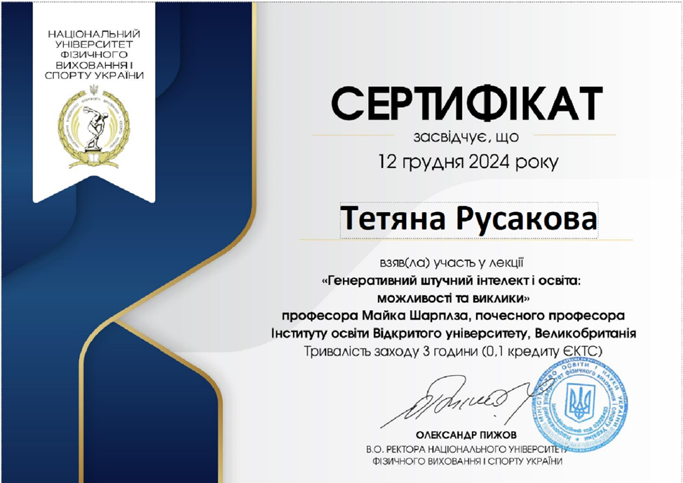 10. Тренінг «Генеративний штучний інтелект і освіта: можливості та виклики», 12.12.2024 р, 0,1 кредит, сертифікат, затв. ВР ФТФ, пр. № 5 від 25.12.2024 р.