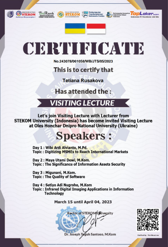 7. Підвищення кваліфікації за фахом University (Indonesia) Certifica 243078/061058/WB/JTS/05/202 15.03-4.04. 2,0 кредити. Затв. ВР ФТФ 10.10.23 р. пр. №2.