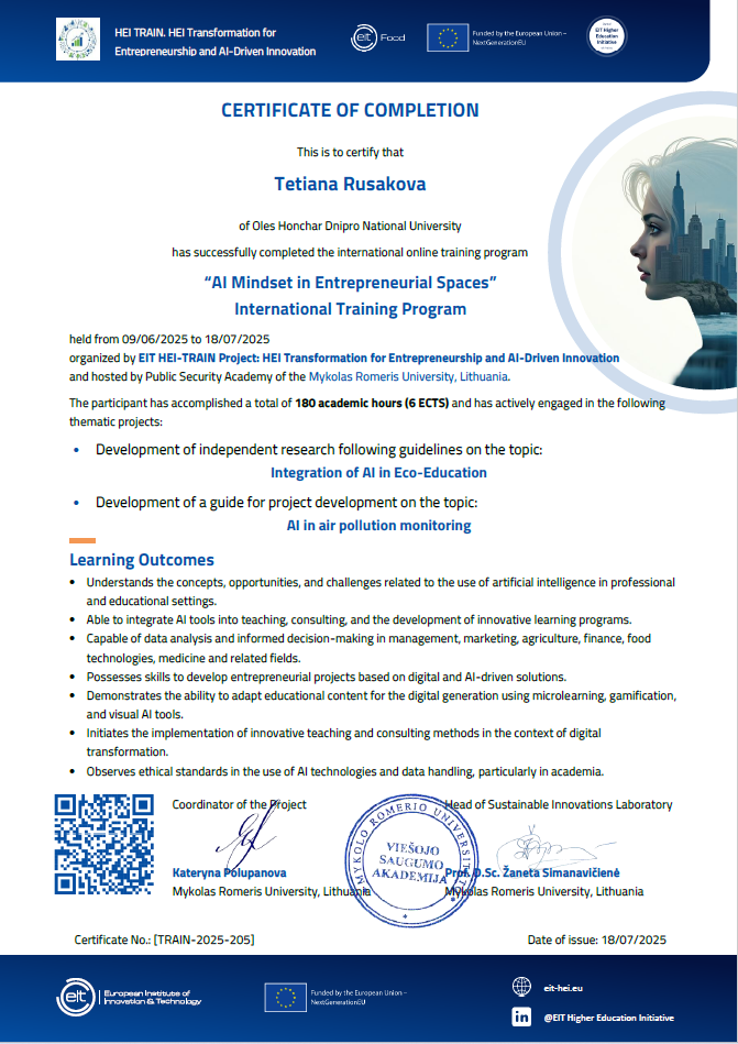 17. AI-driven entrepreneurial ecosystems. The international Training for Trainers program. HEI TRAIN project (HEI Transformation for Entrepreneurship and AI-Driven Innovation) is part of the EIT HEI Initiative: Innovation Capacity Building for Higher Education, and is funded by the European Union 09.06.25 – 18.07.25, 6 кредитів, сертифікат затв. ВР ФТФ 16.09.2025, пр. №1ст.