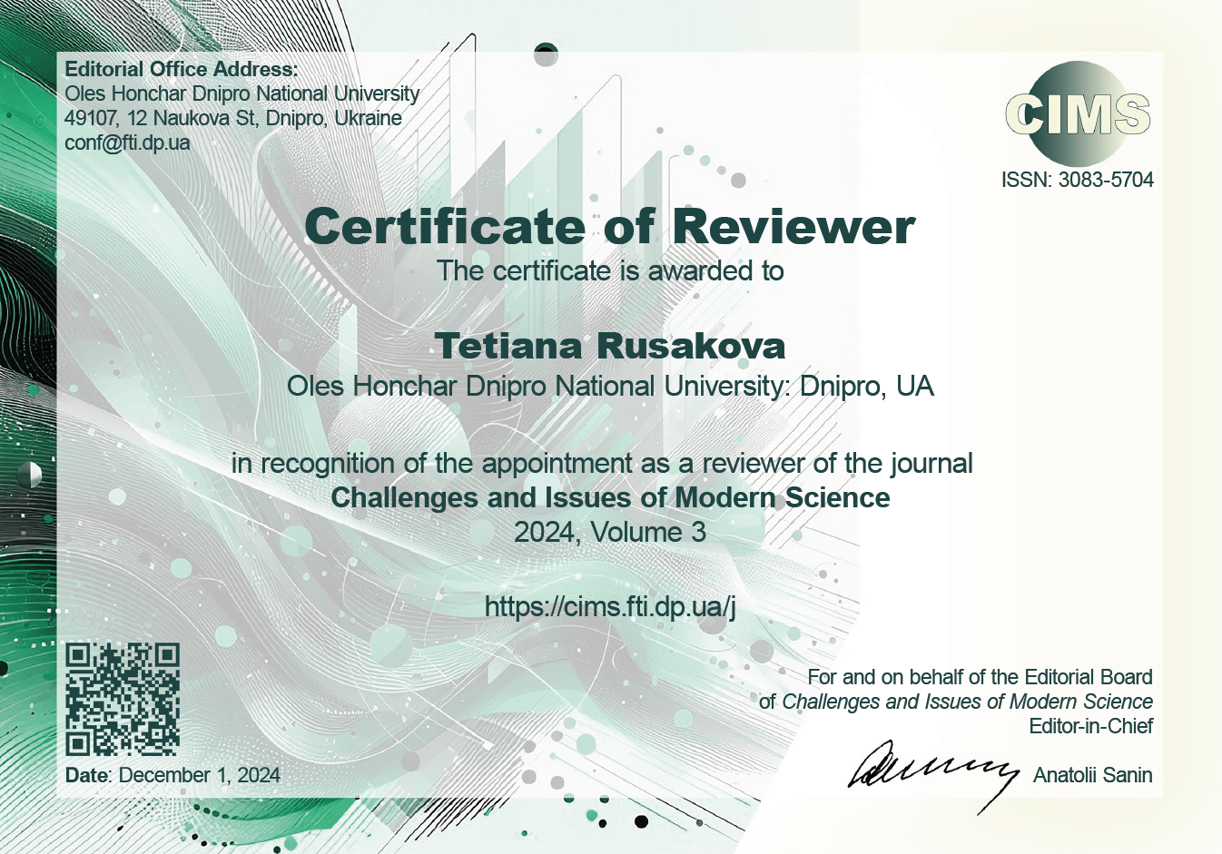 Членкиня редакційної колегії наукових видань: «Technology audit and production reserves» та «Challenges and Issues of Modern Science».