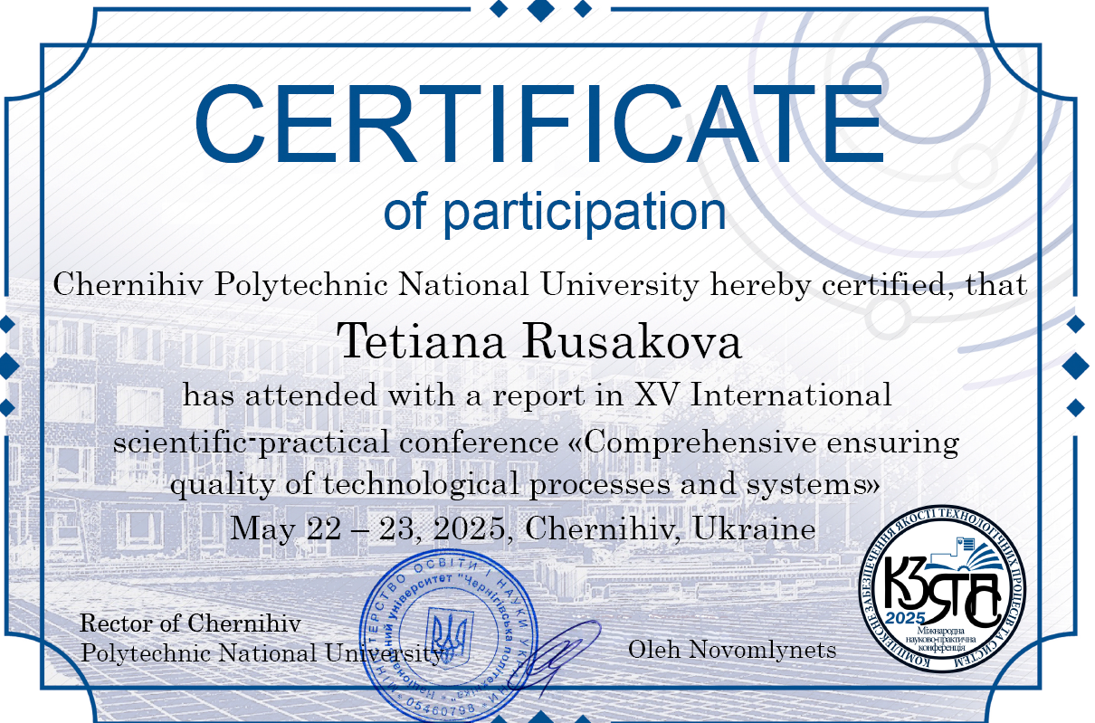 15. Науково-педагогічне стажування «Сhallenges and issues of modern science», 27.05–30.05.2025 р: Сертифікат №MMXXV1027 – 1 кредит, затв. ВР ФТФ, пр. № 11 від 10.06.2025 р.