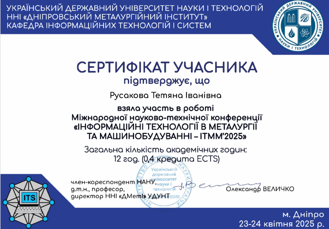 13. Міжнародна науково-технічна конференція «Інформаційні технології в металургії та машинобудуванні» – ІТТМ’2025, 23-24.04.2025, 0,4 кредити, затв. ВР ФТФ, пр. №10 від 13.05.2025 р.