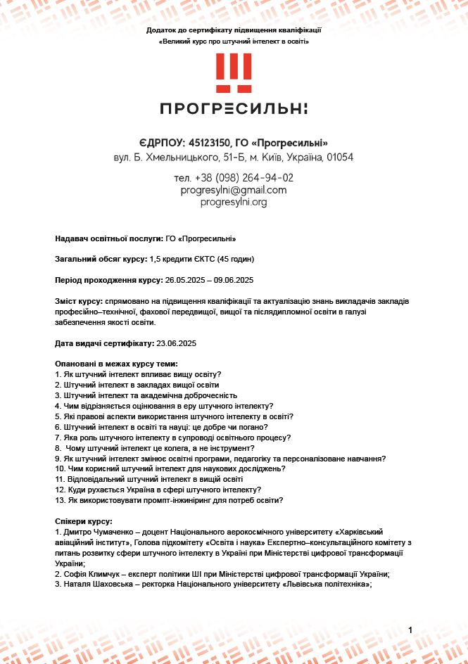 16. Прогресильні. Великий курс ПРО Ш І в освіті, за підтримки Міністерства цифрової трансформації України, Міністерства освіти України: 26.05.2025–09.06.2025, 1.5 кредити, затв. ВР ФТФ, пр. № 12 від 24.06.2025 р.