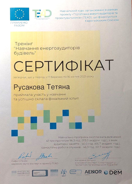 14. Тренінг «Навчання енергоаудиторів будівель». Навчальний курс організовано в рамках проєкту «Підготовка енергоаудиторів та проєктувальників (ТEAD)», що фінансується Європейским Союзом, 17.03-16.04.25, 4.3 кредити, затв. ВР ФТФ, пр. №10 від 13.05.2025 р.