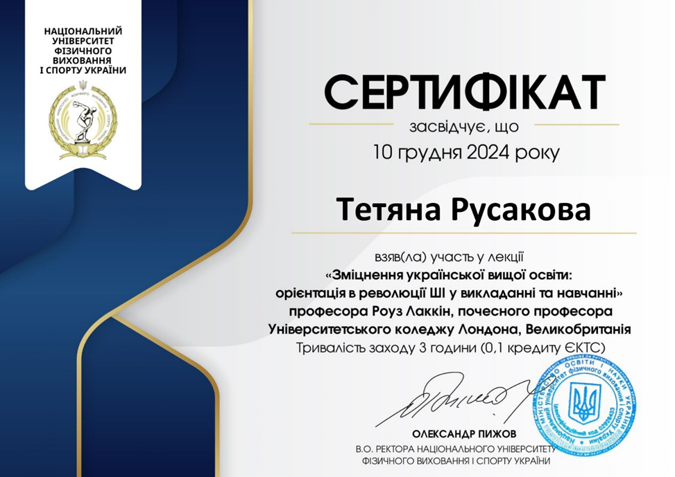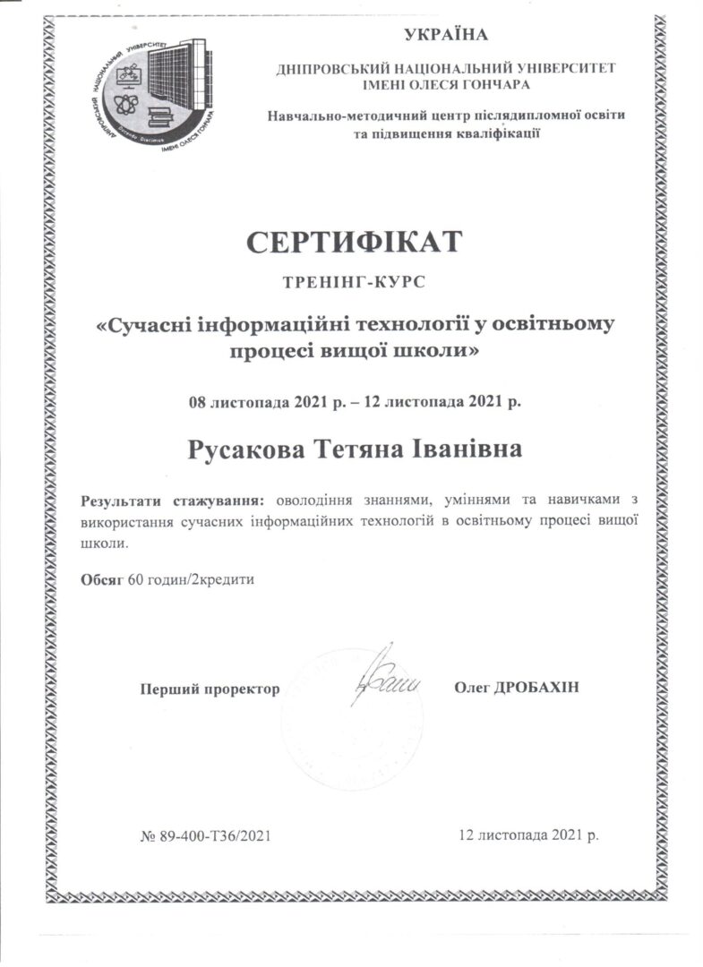 2. Навчально-методичний центр післядипломної освіти та підвищення кваліфікації ДНУ; програма «Сучасні інформаційні технології у освітньому процесі вищої школи», 08.11-12-11 2021; сертифікат №89-400-ТЗ6/2021 від 12.11.2021, 2 кредити.