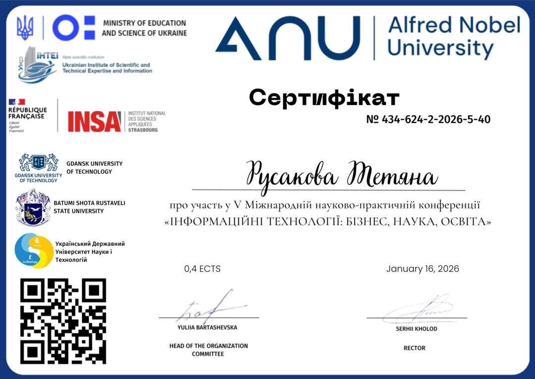 19. Кіберграм. Рівень цифрової грамотності в сфері Безпека в цифровому середовищі. Міністерство цифрової інформації України, сертифікат D0001543294, від 13.12.2025 р., 0,5 кредити,. Затв. ВР ФТФ 15.01.2026, пр. № 2.