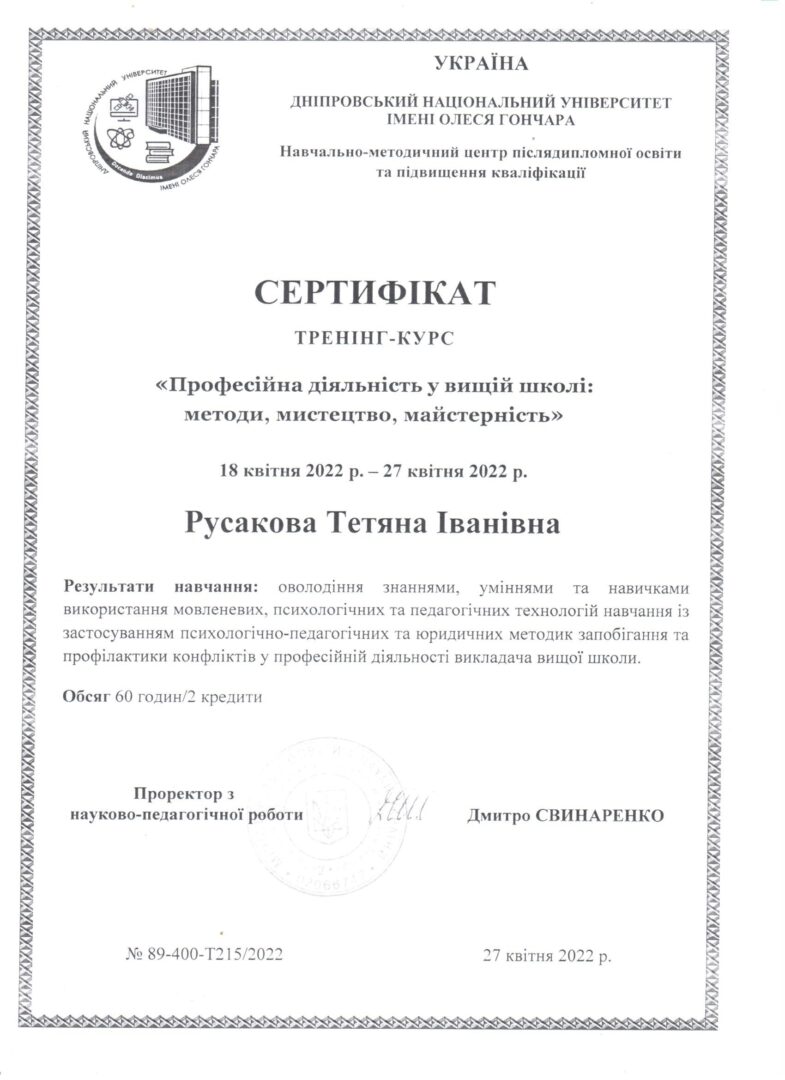 3. Навчально-методичний центр післядипломної освіти та підвищення кваліфікації ДНУ; програма «Професійна діяльність у вищій школі: методи, мистецтво, майстерність» 18.04-27.04.2022, сертифікат №89-400-Т215/2022 від 27.04.2022, 2 кредити.