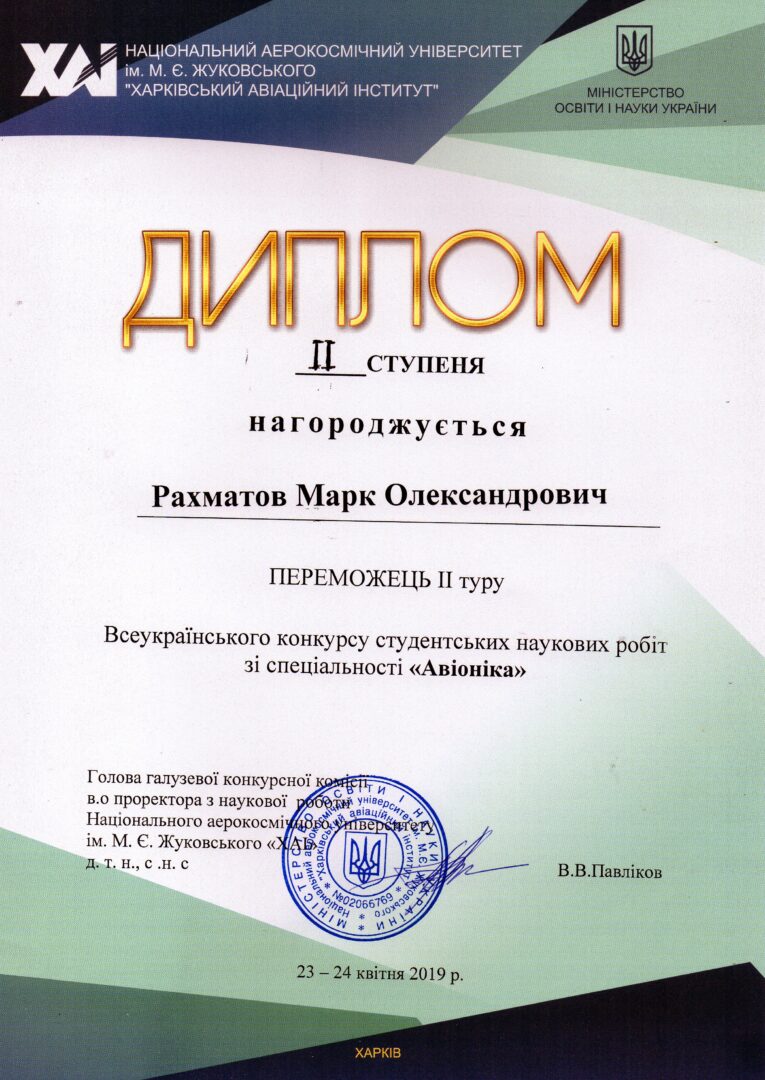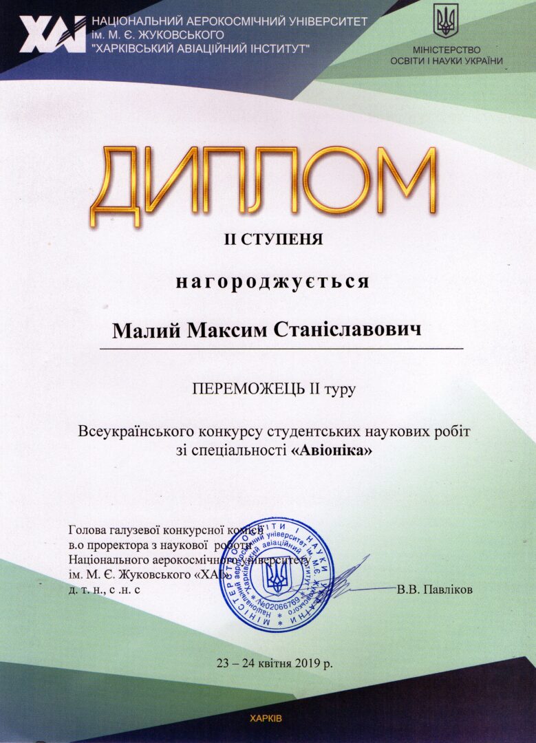 СЕРТИФІКАТИ УЧАСНИКІВ І ДИПЛОМИ ЗА КРАЩІ ДОПОВІДІ ЗДОБУВАЧІВ ДРУГОГО РІВНЯ ОСВІТИ ЗА ОП «АВІОНІКА»